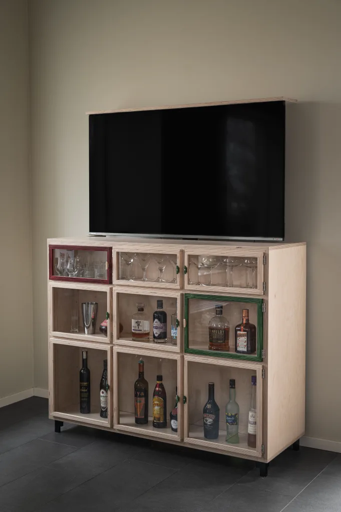 TV-skåp som lyfter fram din TV när du vill ha den. Annars gömmer du den i skåpet.